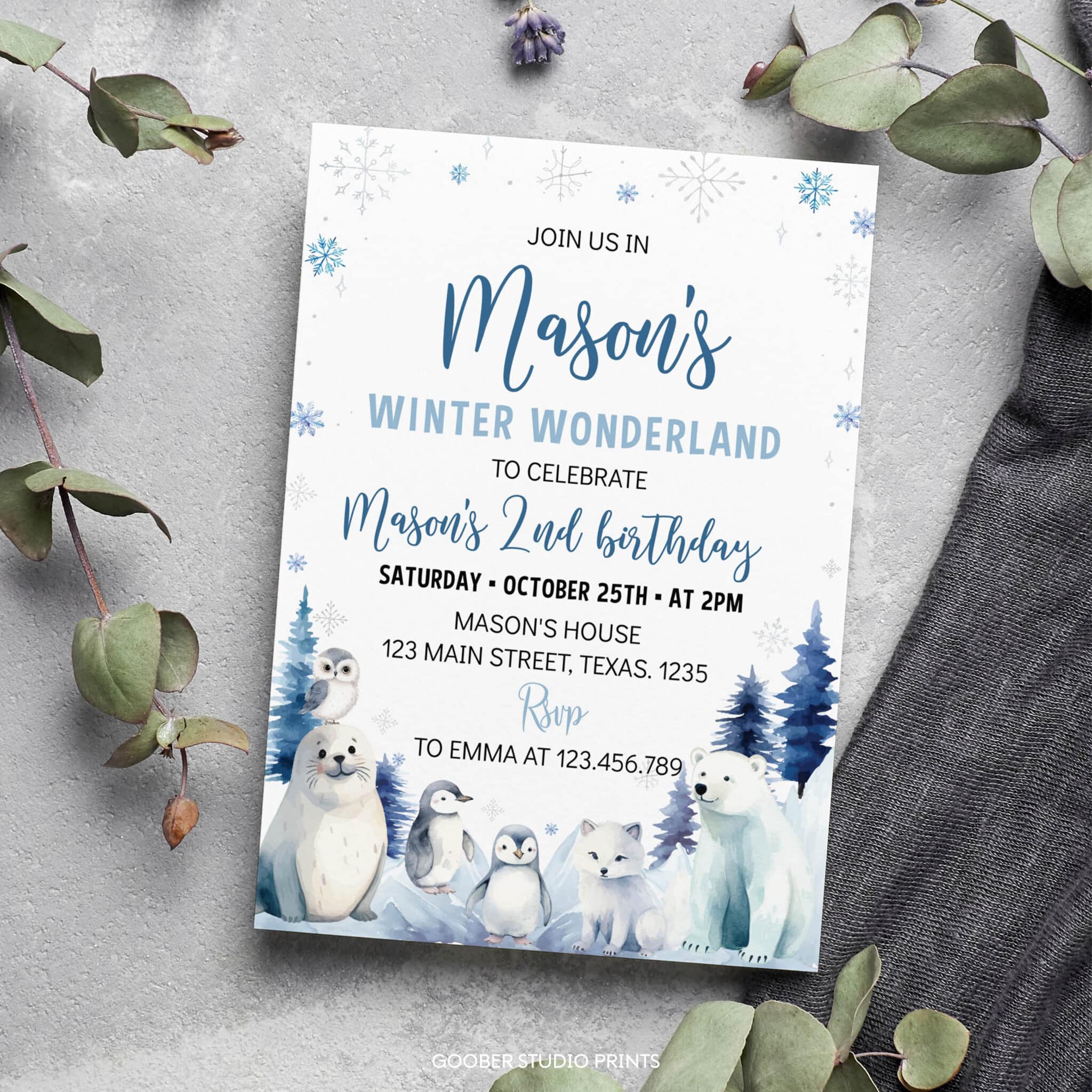 Celebrate your little one’s winter birthday in style with our charming invitation! Featuring playful arctic animals, sparkling snowflakes, and cozy winter accents, it’s the perfect fit for a magical winter wonderland theme. Fully customizable with your child’s name, age, and party details, this invitation sets the scene for an unforgettable celebration. Easy to personalize and print at home, it’s a fun and budget-friendly way to make your child’s snowy milestone extra special.