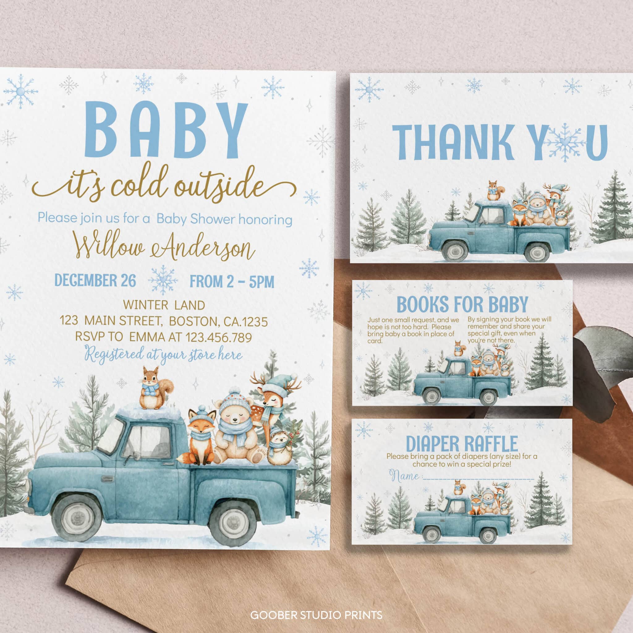 Celebrate your baby boy with our charming winter baby shower invitation set! Designed with adorable woodland animals, a cute blue truck, shimmering snowflakes, and serene winter forest accents, this collection perfectly captures the cozy spirit of a winter party. The customizable invitation allows you to include all your shower details—date, time, and location—while matching pieces feature a diaper raffle card, a Books for Baby card, and a coordinating thank-you card. A heartwarming winter-inspired set that adds a touch of seasonal magic and woodland charm to your baby shower celebration.
